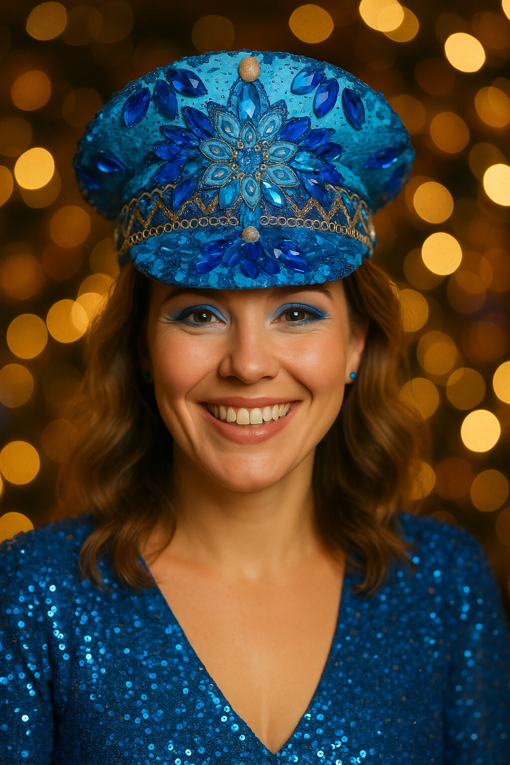 Maak je look compleet en word het stralende middelpunt van de avond met deze unieke blauwe glamour pet! 🎉